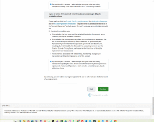阅读开户说明(含 0 美元开户门槛提示,原 25,000 美元门槛已取消),点击 “Get started” 并同意相关声明条款。